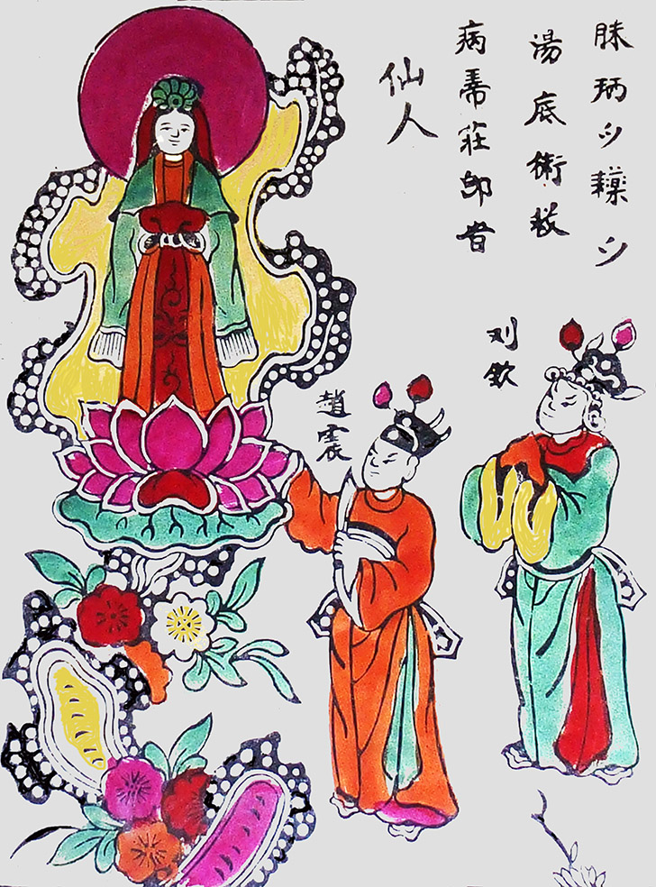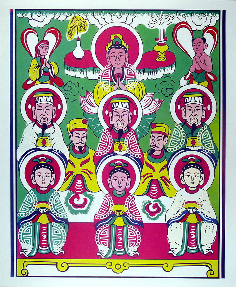 Si les estampes représentant des génies ou des divinités taoïstes sont assez nombreuses, celles se référant au bouddhisme sont plutôt rares, car il ne s’agit pas, pour l’essentiel, d’images de culte.