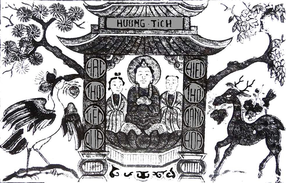 Plusieurs estampes de Đông Hồ représentent la Déesse assise dans une pagode située aux Montagnes des Parfums (Hương Sơn), dans la grotte des Vestiges Parfumés (Hương tích). Elles sont toutes construites sur le même modèle : une pagode/autel au centre (avec la divinité) et un animal de chaque côté symbolisant des souhaits qui sont repris dans deux sentences parallèles. Elles correspondent à des vœux qu’on adresse à une personne ou une famille à qui on souhaite également la protection de la Déesse.