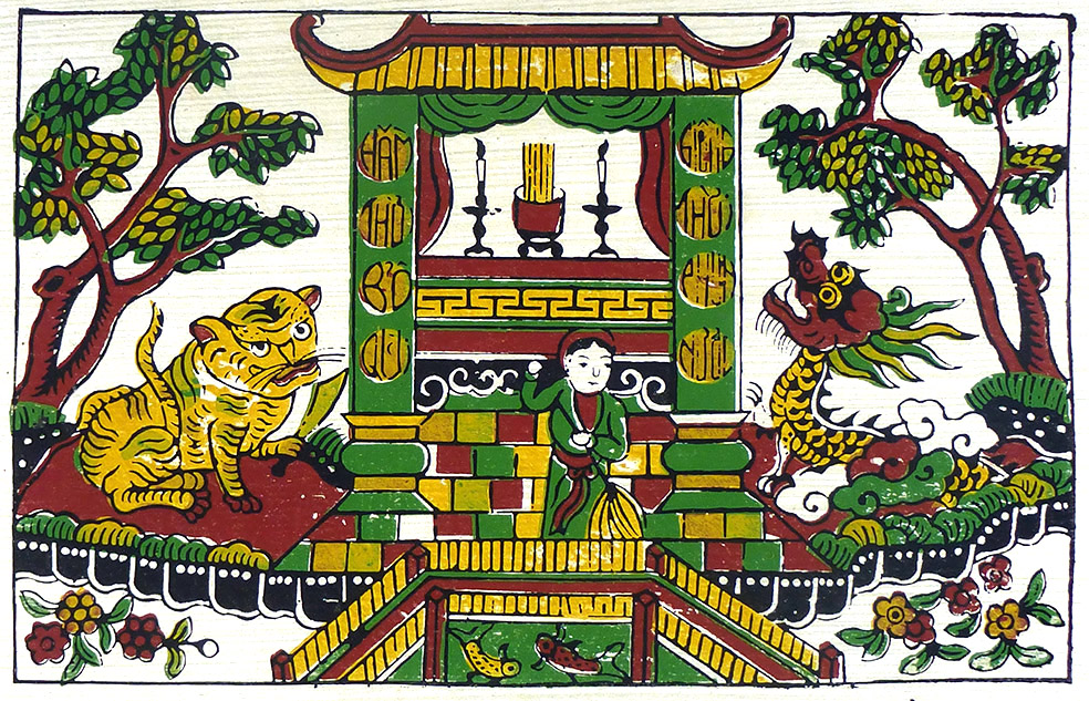 Trên hình vẽ, Diệu Thiện đang đứng quét sân chùa. Bên cạnh nàng có một con cọp và một con rồng, ngoài vai trò bảo vệ và che chở, chúng còn giúp nàng trong công việc nội trợ. Trên hai câu đối, bên trái có “Hầm thời bổ quỉ” (Cọp đánh quỉ dữ), bên phải “Rồng thời phun nước”.