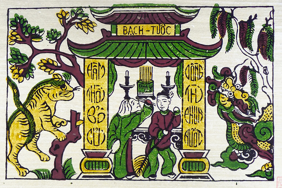 L’image montre Quan Âm Thị Kính, en habit masculin, en train de balayer devant une pagode du monastère de l’Oiseau blanc (Bạch tước) et poursuivie de ses assiduités par Thị Mầu. Les sentences parallèles signifient : à gauche, Hầm thời bổ củi « Le tigre fend le bois» ; à droite : Rồng thì phun nước « le dragon souffle de l’eau ». Le dragon, que l’on voit ici émerger des nuages, est un animal bénéfique censé apporter la pluie (souffle de l’eau). C’est donc un souhait de bonnes récoltes et donc de prospérité. Le tigre protège les humains en combattant les esprits malfaisants.