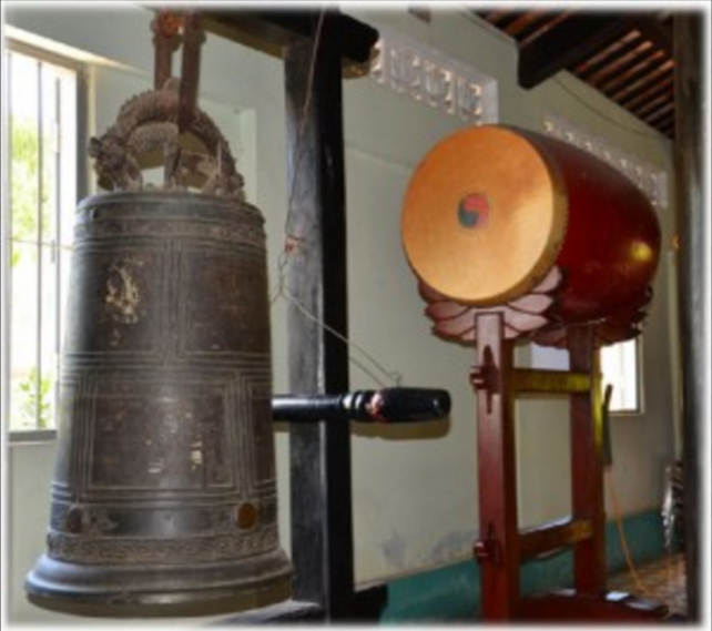 Nghe nói thế, mãng xà chồm lên toan ăn thịt thư sinh, chàng bèn nhắc lại điều kiện đã giao kết, rồi cả hai lại tiếp tục đi. Đi được một lúc, họ gặp một con cá gáy (chép) to lớn lâu năm sắp hóa thành tinh. Nghe hết tự sự và câu hỏi dò ý kiến trên, cá cũng trả lời như trâu. Thư sinh bắt đầu lo ngại cùng mãng xà lại ra đi. Kẻ thứ ba mà cuối cùng họ gặp trên đường là một người già cả, râu tóc bạc phơ. Ông cụ này không ai khác hơn là Phật Thế Tôn ở trên trời nghe thấy rõ mọi việc xảy ra giữa chàng thư sinh với con mãng xà bạc ác cùng những lời lẽ của trâu và cá gáy, liền hóa ra một ông lão để gặp họ. Sau khi nghe thuật lại đầu đuôi câu chuyện tranh chấp giữa đôi bên, Phật liền mời cả hai về nhà. Phật dùng phép thần thông gọi trâu cùng cá gáy đến đủ mặt, rồi cả năm bước vào nhà Phật, một ngôi chùa. Qua khỏi cửa chùa ông lão trở lại nguyên hình Phật Thế Tôn, ngỏ lời bênh vực cho lẽ phải của thư sinh, nghiêm khắc lên án sự bội bạc vô ơn của mãng xà, cùng sự xấu bụng của trâu và cá gáy. Rồi để trừng phạt cả ba con, Phật bắt mãng xà hóa ra cái chuông, trâu hóa thành cái trống, cá gáy hóa thành mõ. Vì thế từ đó giá chuông nhà chùa đúc theo hình con rắn, trống bịt bằng da trâu và mõ làm theo hình cá gáy. Để nhắc nhở các nhà tu hành nhớ sự tích này mà luôn luôn giữ lấy lòng ngay thật hiền lành, bất cứ ngày đêm mỗi lần đọc kinh đều phải gõ vào ba vật nói trên