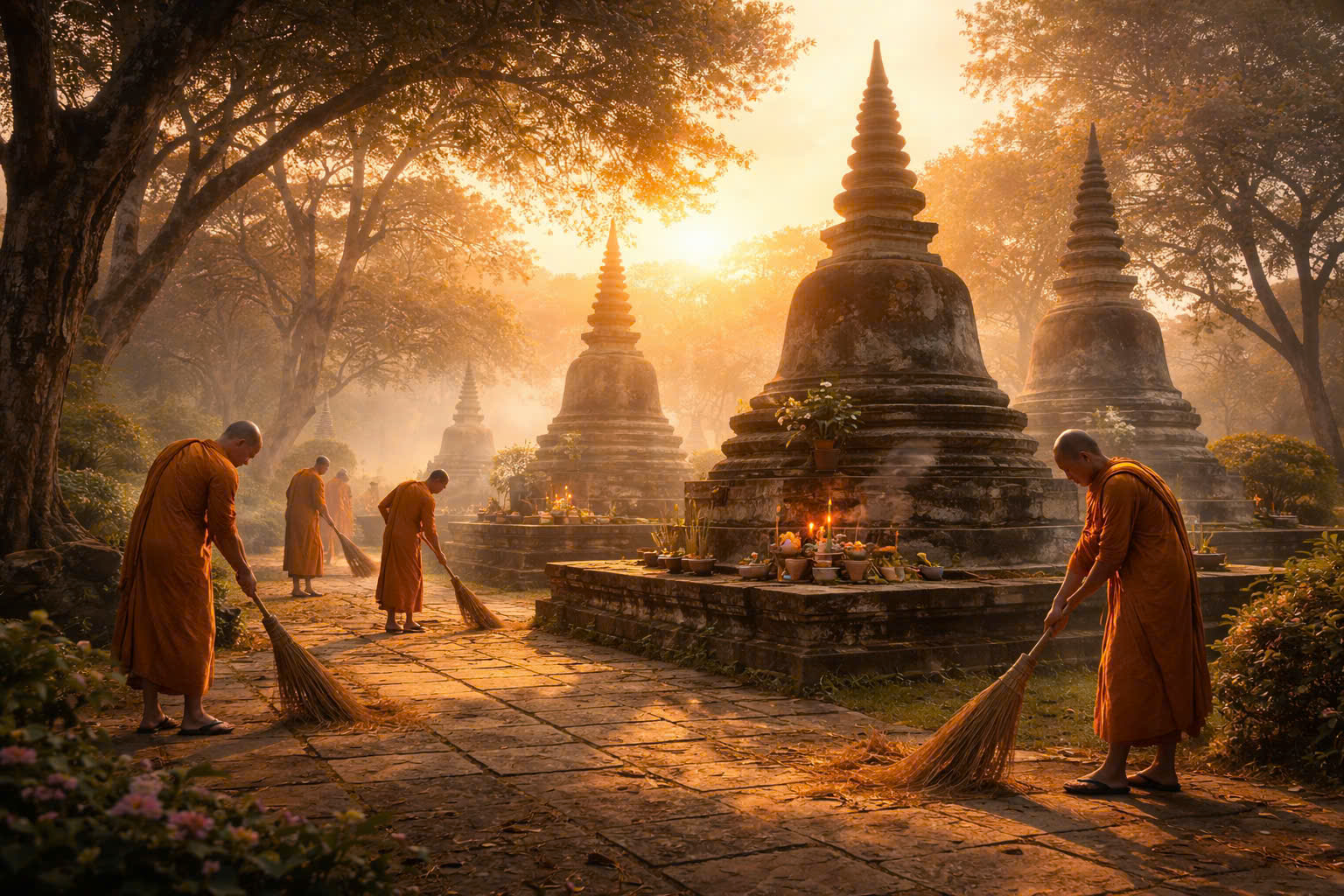 Rêu bám nơi tháp, bụi phủ lối đi, đó là ngôn ngữ vô thường của thời gian. Quét dọn cuối năm, để ta dễ nhận ra: mọi thứ đều đang biến đổi. Và đời người, cũng đang đi qua bốn mùa như thế.