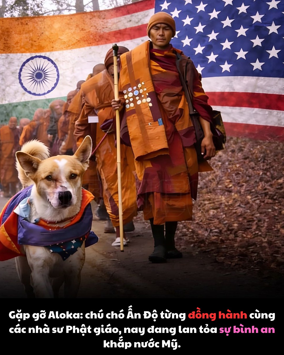 Từng là chó hoang… giờ đây em đi bộ 3.700 km cùng các nhà sư để lan tỏa hòa bình.
