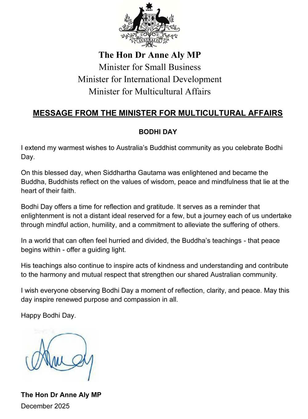 THÔNG ĐIỆP CỦA BỘ TRƯỞNG ĐA VĂN HÓA KÍNH GỬI CỘNG ĐỒNG PHẬT GIÁO ÚC CHÂU NHÂN NGÀY LỄ THÀNH ĐẠO (BODHI DAY)