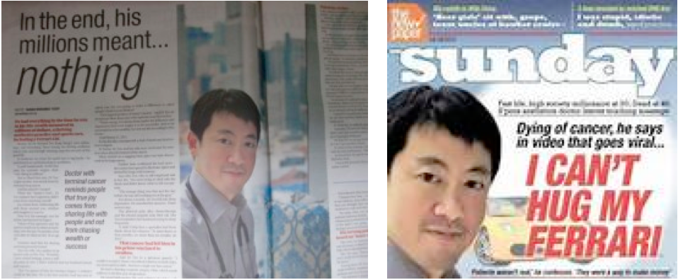 Bác sỹ RICHARD TEO KENG SIANG qua đời ngày 18 tháng 10 năm 2012 khi mới có 40 tuổi. Anh lấy vợ được 6 năm và chưa có con. Sau khi tích cực đua tranh trong cuộc đời, sau khi ngụp lặn trong tiền bạc, sau khi hả hê với danh vọng, chỉ khi cận kề với tử thần anh mới rút tỉa ra được đôi điều chân lý. Khi lìa đời thời của cải bạc triệu cũng không còn nghĩa lý gì nữa “In the end, his millions meant… nothing”, xe hơi bạc triệu cũng tuột khỏi vòng tay mình “I can’t hug my Ferrari.” TEO không phải là một tín đồ Phật Giáo nên không hay biết rằng những điều này đã được đức Phật dạy từ lâu lắm rồi.