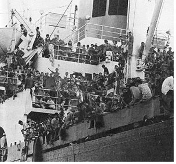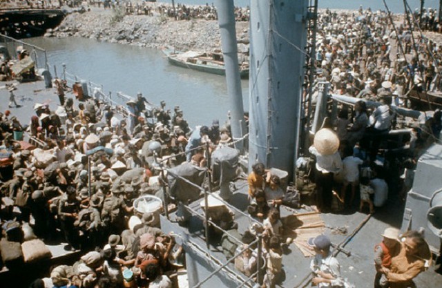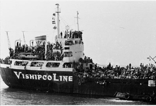 Ngày 21 tháng 4 năm 1975 Long Khánh thất thủKhắp nơi - Dân chạy tránh giặc cọng sản Một chiếc tàu vận tải Vishipco chở số người tị nạn nặng trĩu từ miền trung khi cộng sản tràn vô Một chiếc thuyền tị nạn ở miền trung