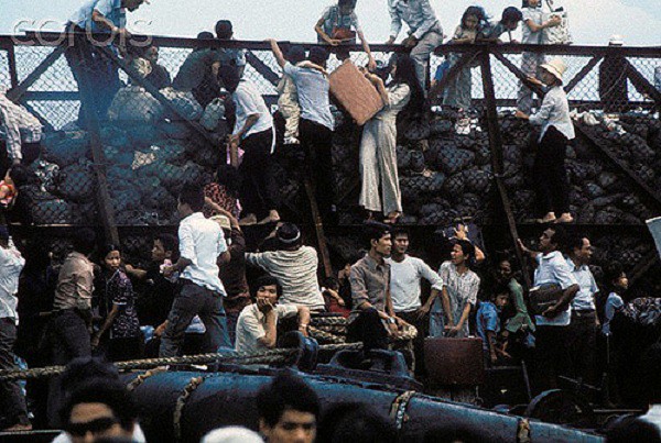 Và những người sài Gòn đang liều mạng trèo lên các xà lan tại bến cảng Sài Gòn họ cố gắng trốn thoát khỏi cộng sản Ngày 29 - 4 - 1975