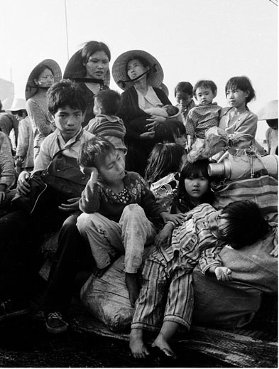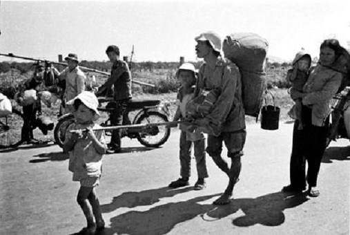 Một gia đình dắt dìu nhau chạy giặc từ miền trung tránh đợt tấn cộng của cộng sản Gia đình và trẻ em chạy giặc từ miền trung vào nam trong ngày cuối tháng 4 năm 1975