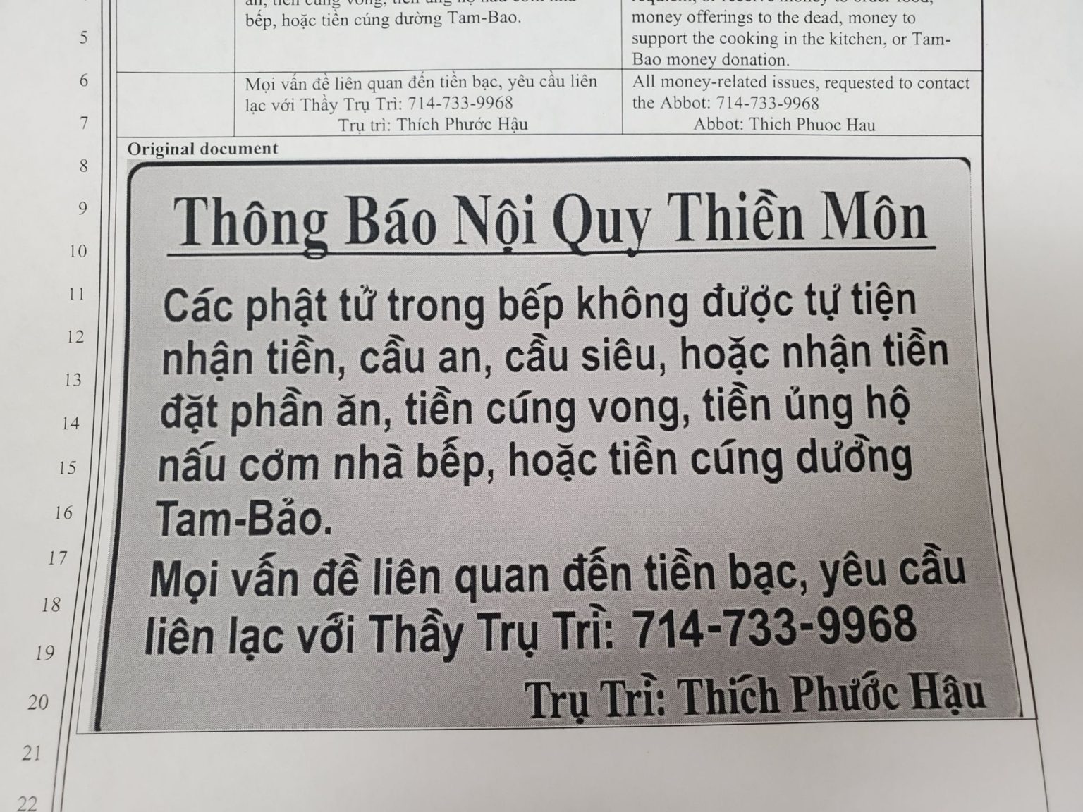 Đơn kiện cũng cho biết vị sư trụ trì từ chối giải thích thu chi ở chùa từ Tháng Sáu, 2019, đồng thời chiếm đoạt sổ sách, báo cáo của chùa.